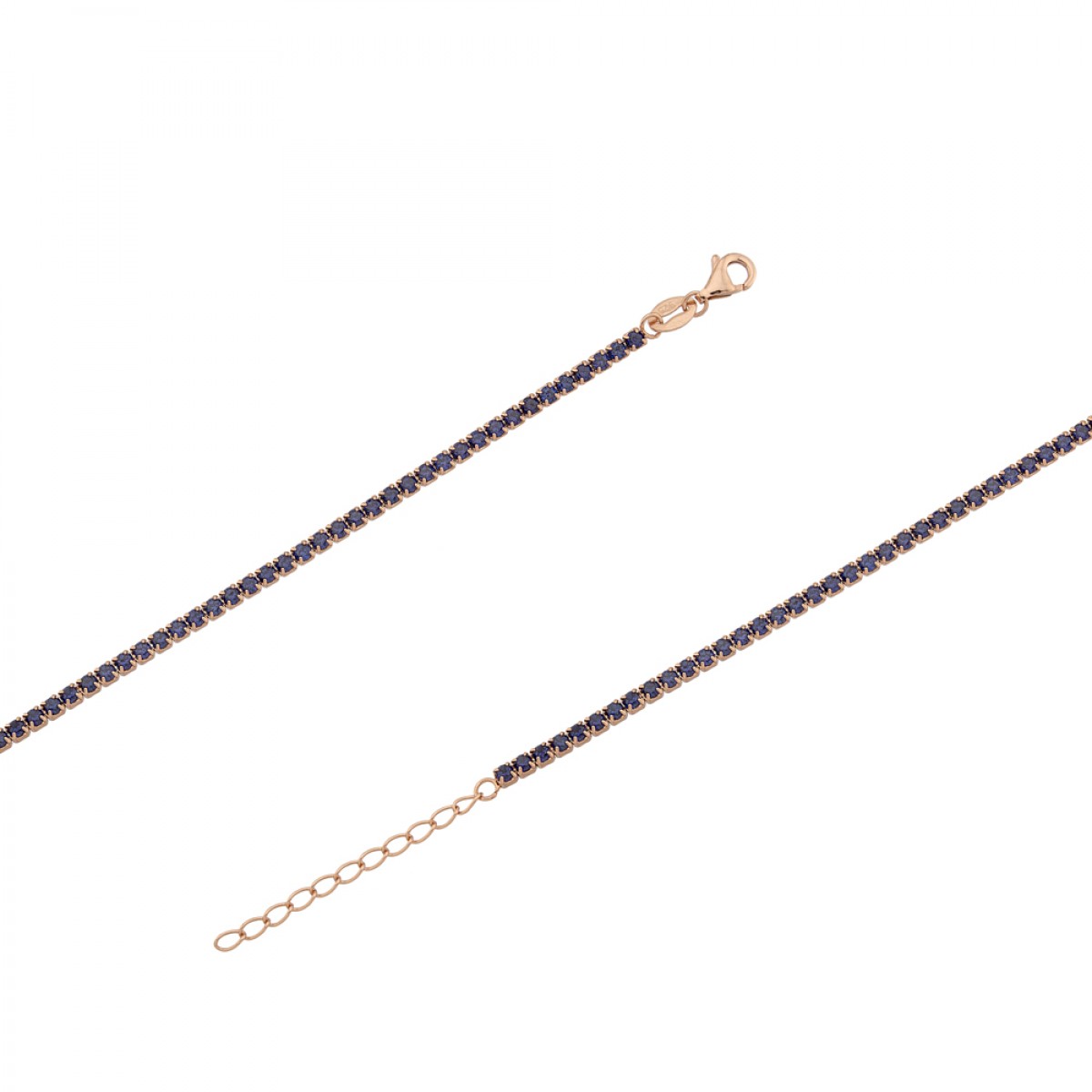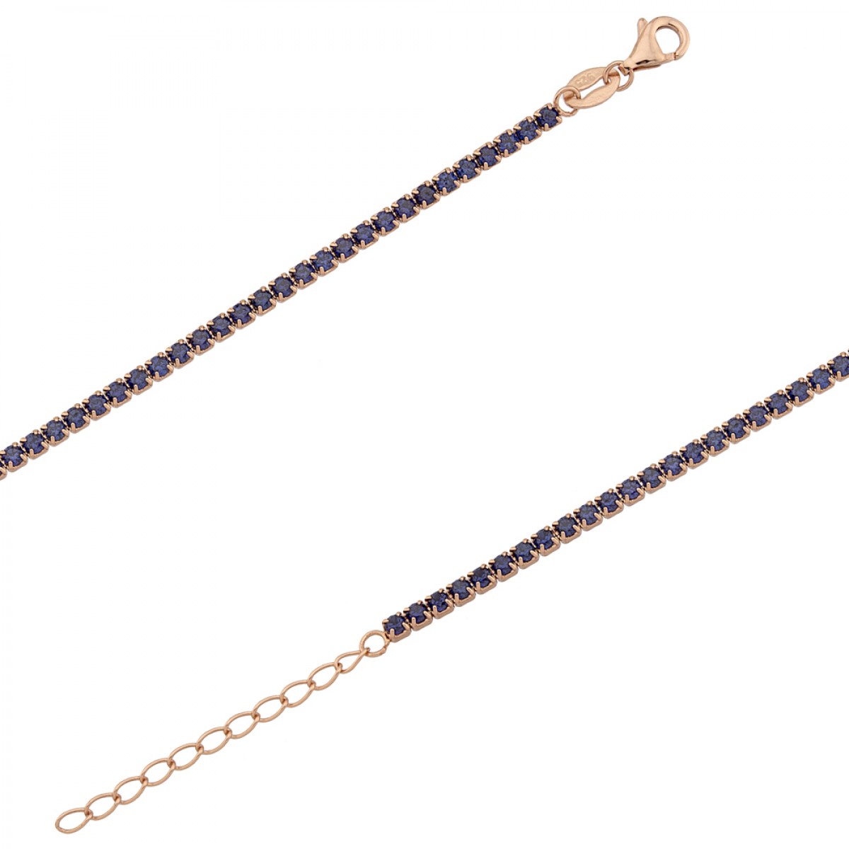 An exquisite riviera bracelet, made of rose gold plated silver 925 with blue cz. Dimensions: 16cm + 3,5cm extension = 19,5cm total lenght, width 2,3mm and thickness 2,15mm