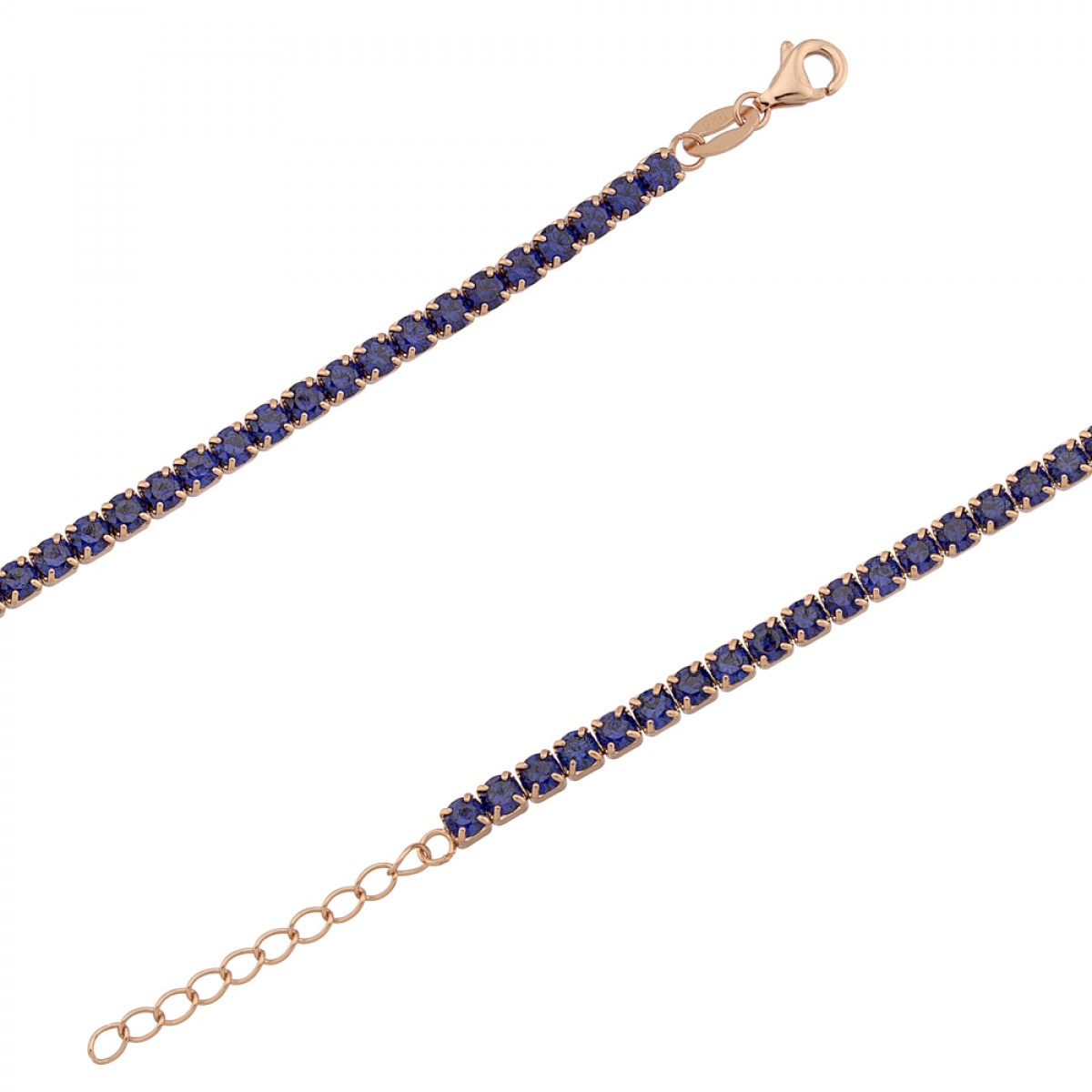 An exquisite riviera bracelet made of rose gold plated silver 925 with blue tanzanite cz. Dimensions: lenght 16mm + 3,5cm extension = 19,5 cm total lenght, width 3,1mm, thickness 2,9mm