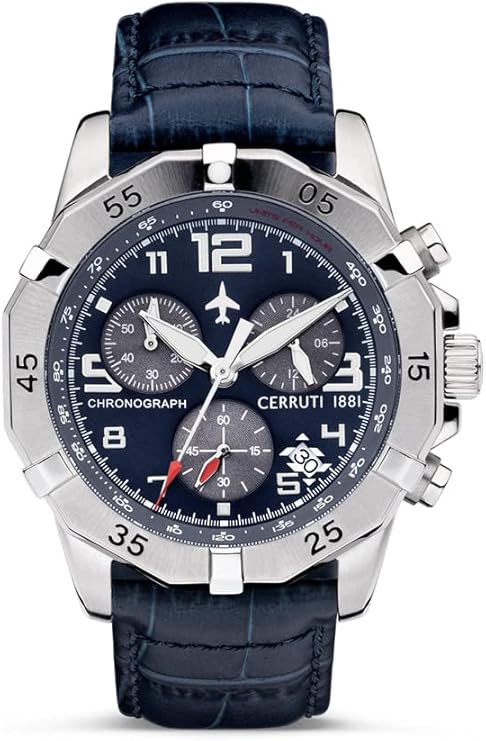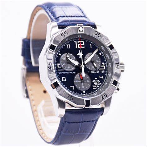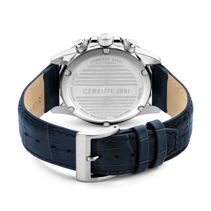 Κομψό και διαχρονικό ανδρικό σπορ ρολόι, με την υπογραφή της φίρμας CERRUTI 1881, με μπλε δερμάτινο λουράκι.