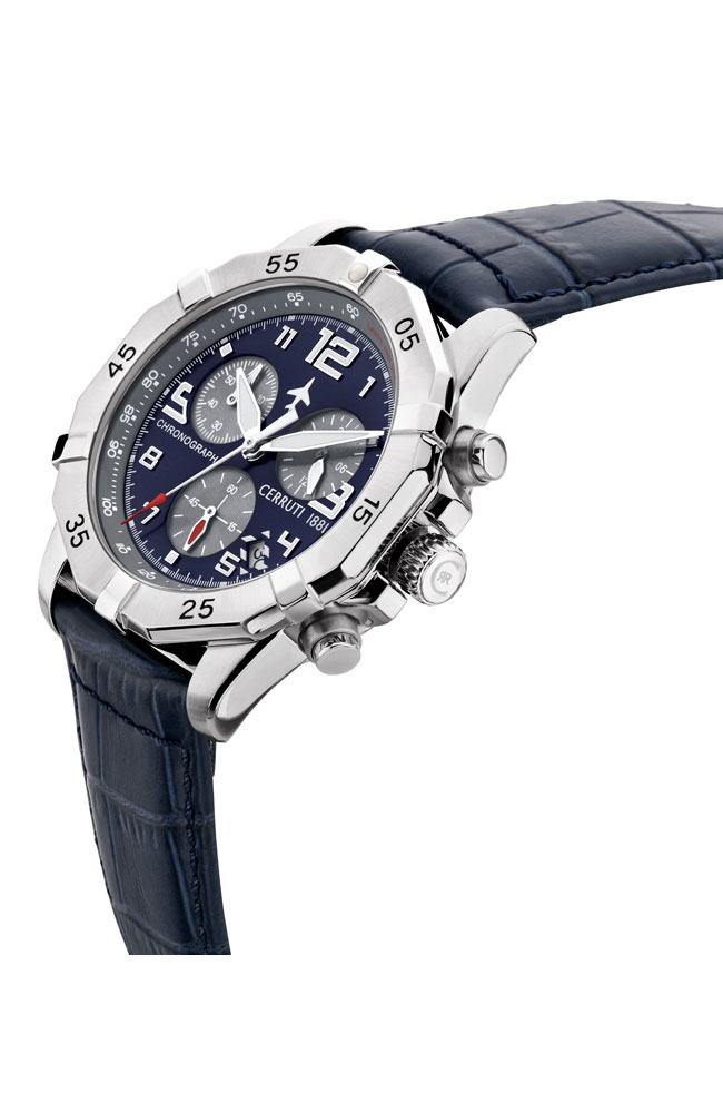 Ανδρικό ρολόι Χρονογράφος Cerruti από ανοξείδωτο ατσάλι με μπλε καντράν και μπλε δερμάτινο λουράκι