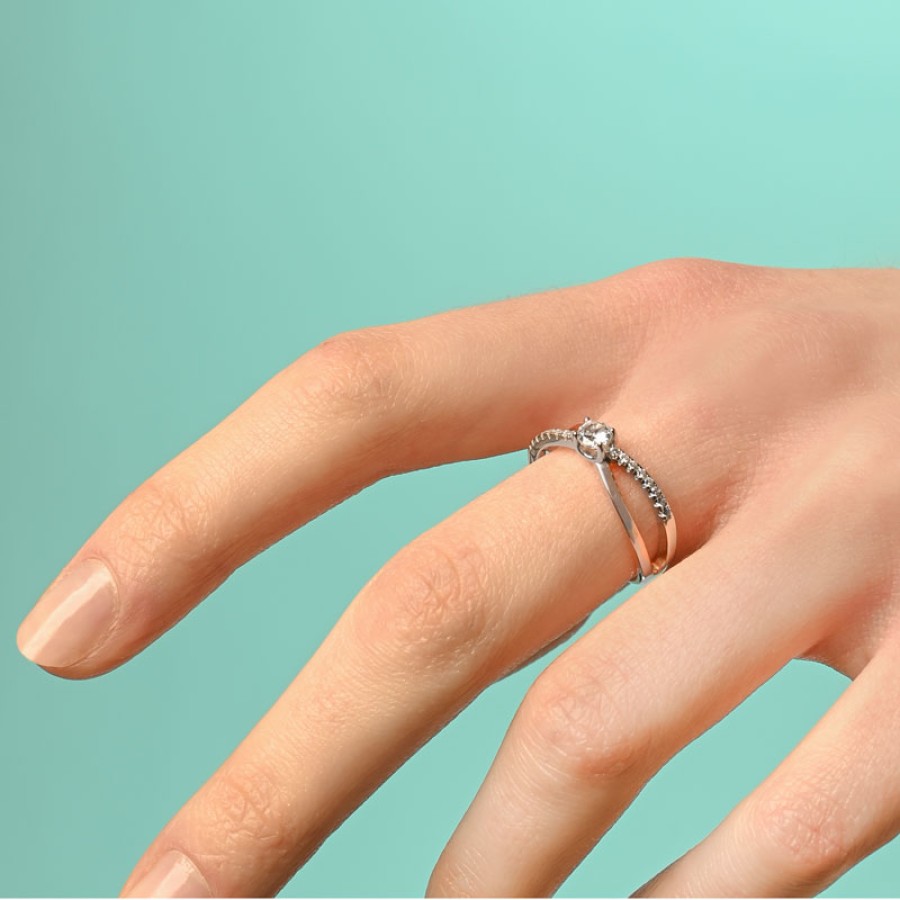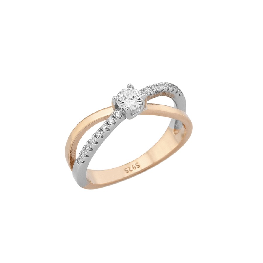 Ένα κομψό δαχτυλίδι δίχρωμο σχέδιο Χ με λευκά ζιργκόν από επιπλατινωμένο και ροζ επιχρυσωμένο ασήμι 925°.