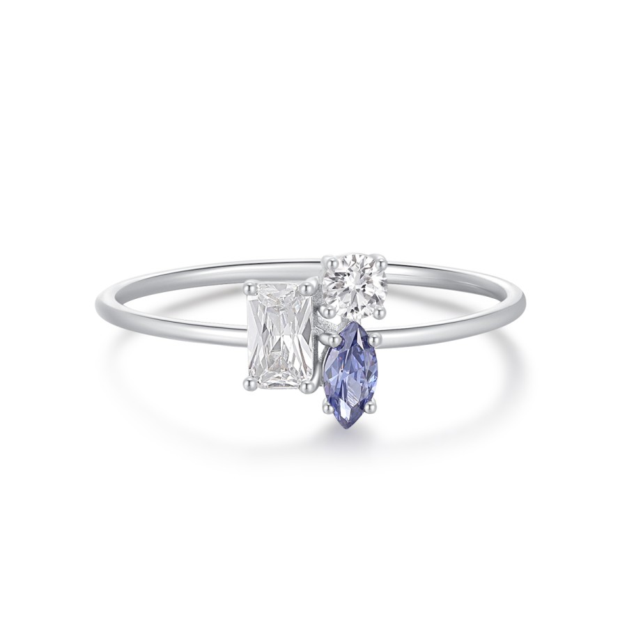 Ένα κομψό δαχτυλίδι σχέδιο τρίπετρο με πέτρες ζιργκόν μωβ και λευκές από επιπλατινωμένο ασήμι 925°.