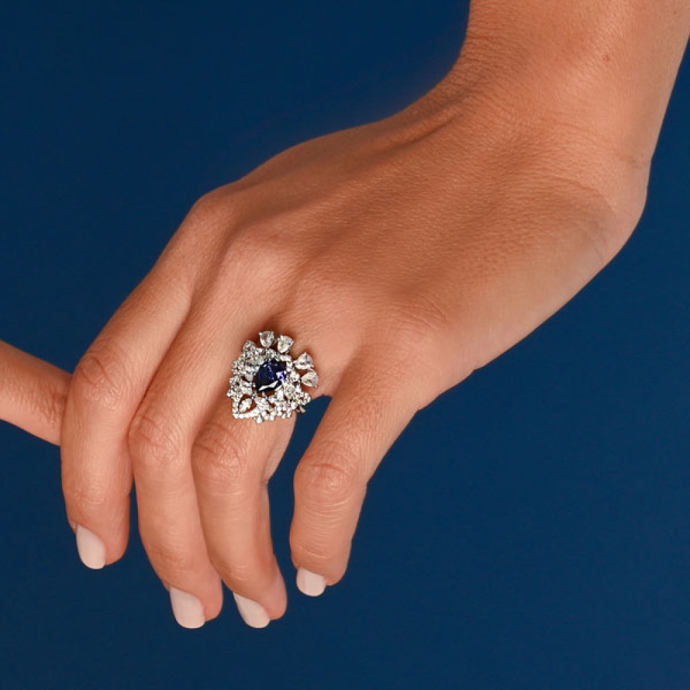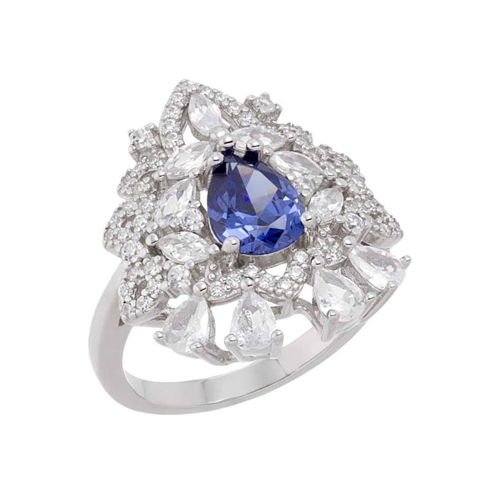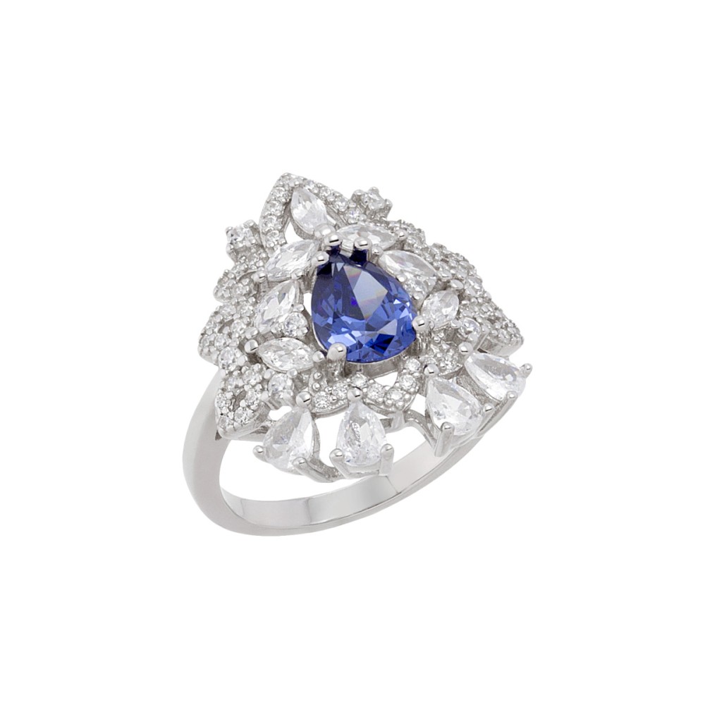 Ένα εντυπωσιακό δαχτυλίδι ροζέτα της collection Jems, με μπλε (Tanzanite blue colour) ζιργκόν, από επιπλατινωμένο ασήμι 925°.