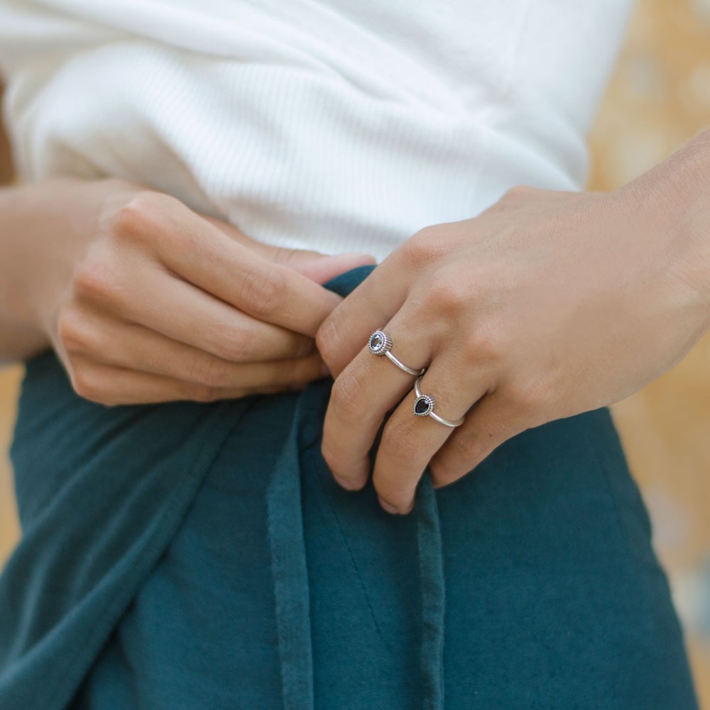 Ένα κομψό δαχτυλίδι σχέδιο στρογγυλό με γαλάζιες πέτρες ζιργκόν από οξειδωμένο ασήμι 925°.