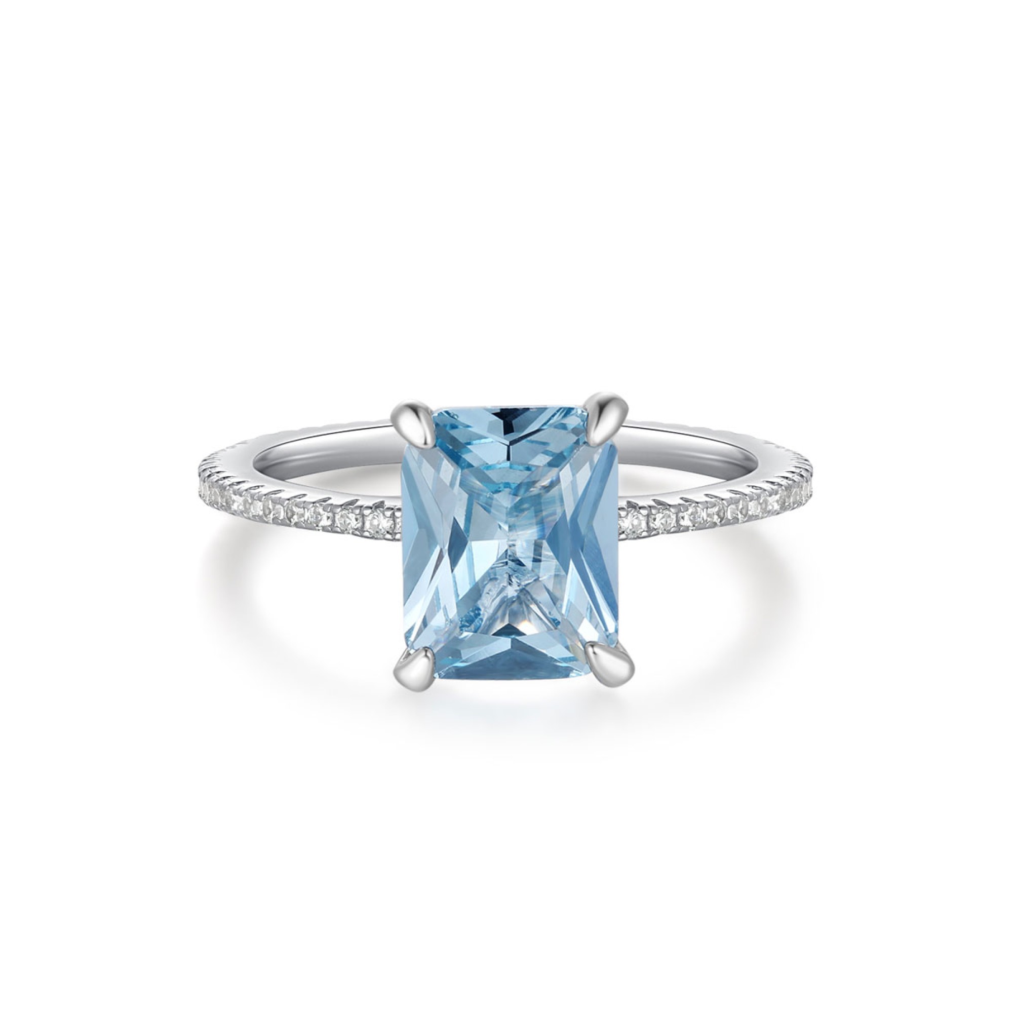 Ένα ιδιαίτερο δαχτυλίδι μονόπετρο σε σχέδιο παραλληλόγραμμο της συλλογής Jems, με κεντρική πέτρα γαλάζιο ζιργκόν κοπής baguette και πλάγια λευκά ζιργκόν, από επιπλατινωμένο ασήμι 925°.