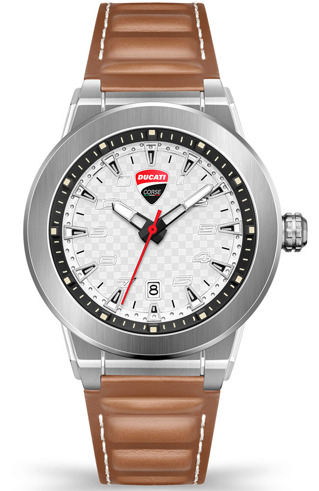 Ανδρικό ρολόι χειρός Ducati Corse από ανοξείδωτο ατσάλι με λευκό καντράν και καφέ δερμάτινο λουράκι.