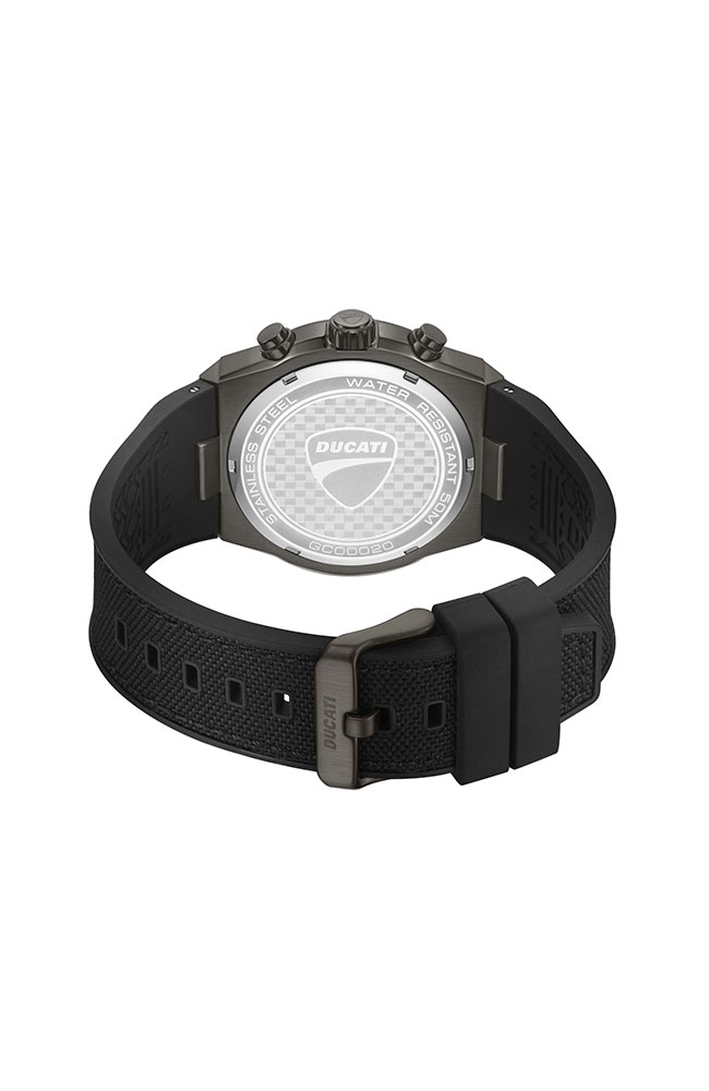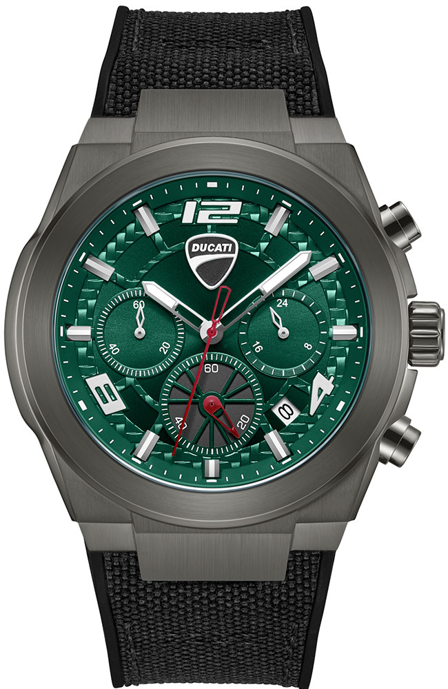 Ανδρικό ρολόι χειρός χρονογράφος Ducati από μαύρο ανοξείδωτο ατσάλι με πράσινο καντράν και μαύρο δερμάτινο λουράκι.