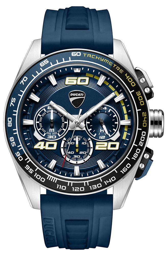 Ανδρικό ρολόι χειρός χρονογράφος Ducati από ανοξείδωτο ατσάλι με μπλε καντράν και μπλε καουτσούκ λουράκι.