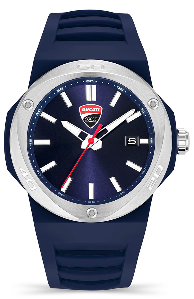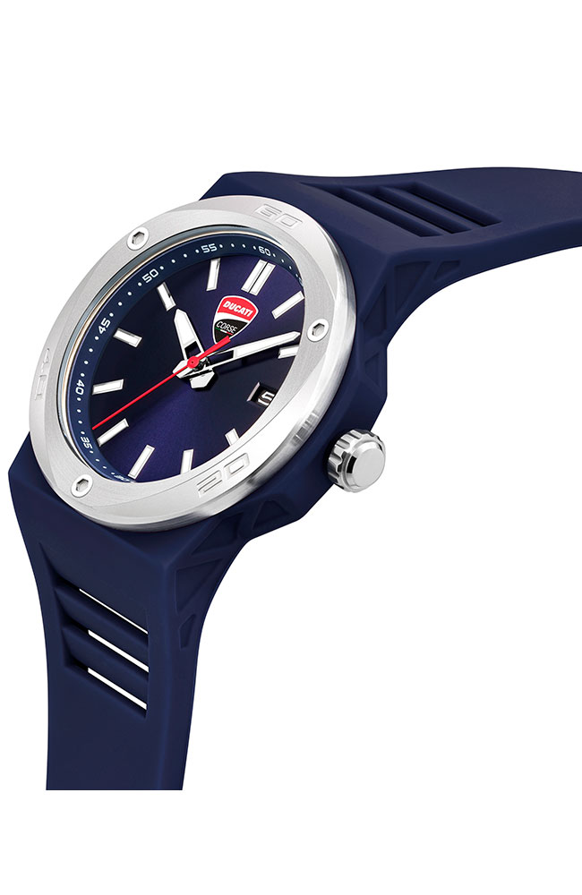 Ανδρικό ρολόι χειρός Ducati από ανοξείδωτο ατσάλι με μπλε καντράν και μπλε καουτσούκ λουράκι.