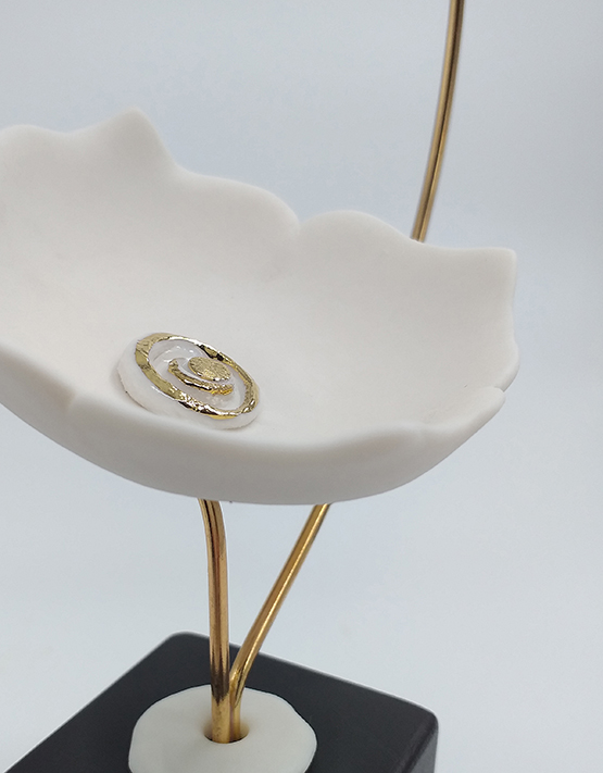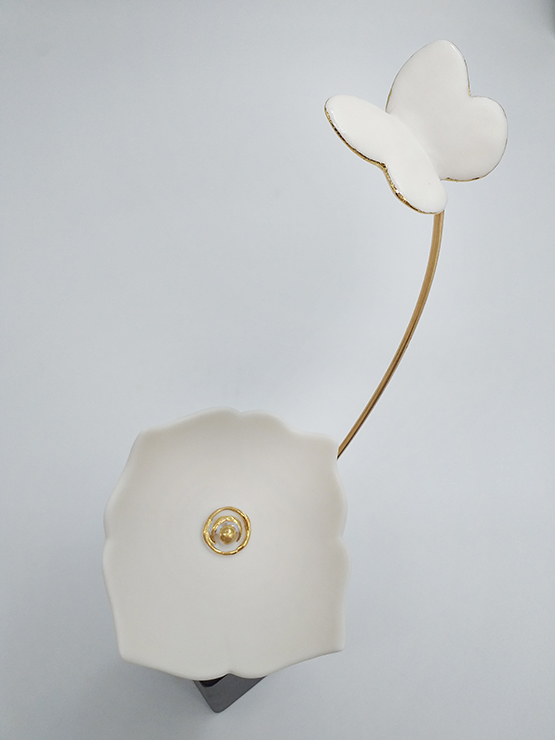 Χειροποίητο επιτραπέζιο διακοσμητικό με αγριολούλουδο, από εξαιρετικής ποιότητας λευκή πορσελάνη, ψημένη στους 1250°C. Ο χρυσός είναι 24k ψημένος στους 840°C. Στηρίζεται σε κεραμική βάση και το μέταλλο που ολοκληρώνει τον σχεδιασμό του είναι λουστραρισμένος ορείχαλκος (μπρούτζος).