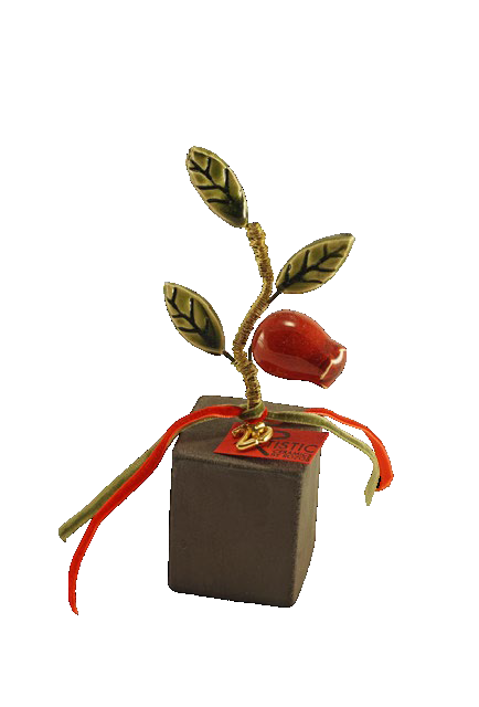 Ένα πανέμορφο γούρι σε σχέδιο γλαστράκι με κλαδί, πράσινα φύλλα και κόκκινο ρόδι, σε καφέ βάση.