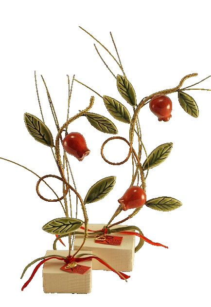 Επιτραπέζιο κεραμικό διακοσμητικό, γούρι κλαδί με ρόδια και φύλλα σε βάση.