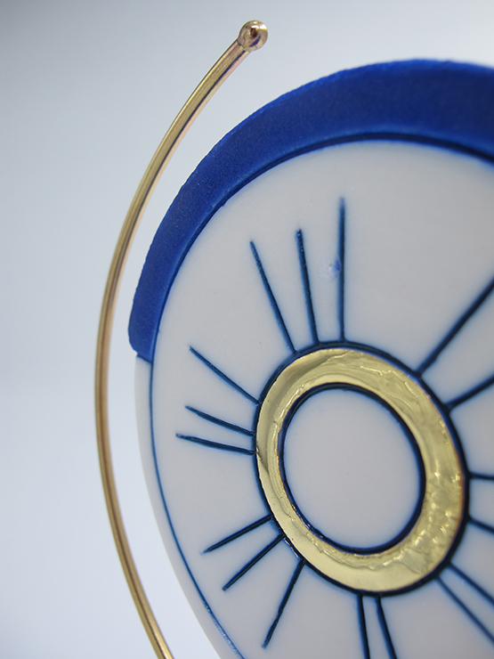 Χειροποίητο επιτραπέζιο διακοσμητικό, από εξαιρετικής ποιότητας λευκή πορσελάνη, ψημένη στους 1250°C. Ο χρυσός είναι 24k ψημένος στους 840°C. Στηρίζεται σε κεραμική βάση και το μέταλλο που ολοκληρώνει τον σχεδιασμό του είναι λουστραρισμένος ορείχαλκος (μπρούτζος).