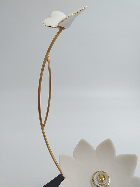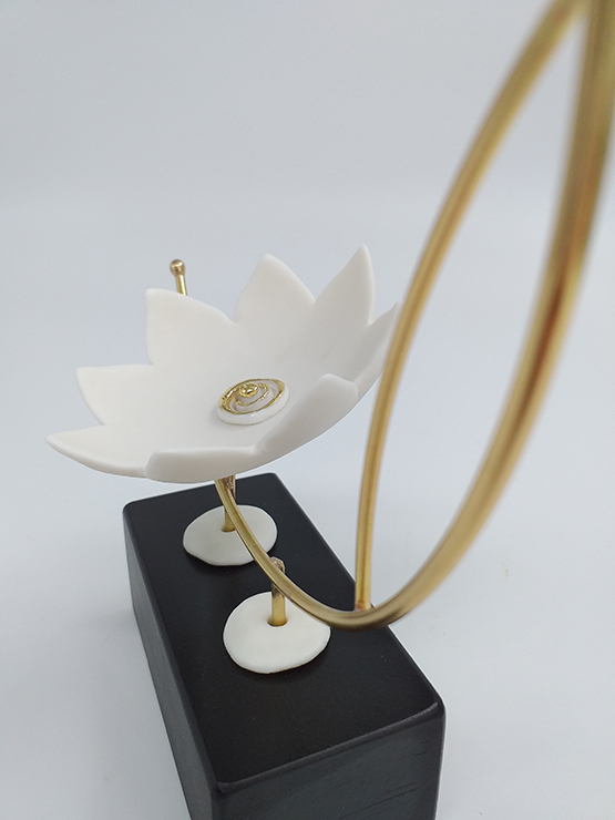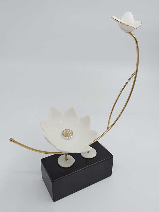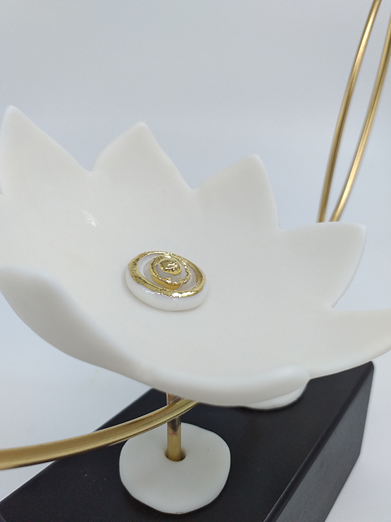 Χειροποίητο επιτραπέζιο διακοσμητικό με νούφαρο, από εξαιρετικής ποιότητας λευκή πορσελάνη, ψημένη στους 1250°C. Ο χρυσός είναι 24k ψημένος στους 840°C. Στηρίζεται σε κεραμική βάση και το μέταλλο που ολοκληρώνει τον σχεδιασμό του είναι λουστραρισμένος ορείχαλκος (μπρούτζος).