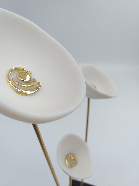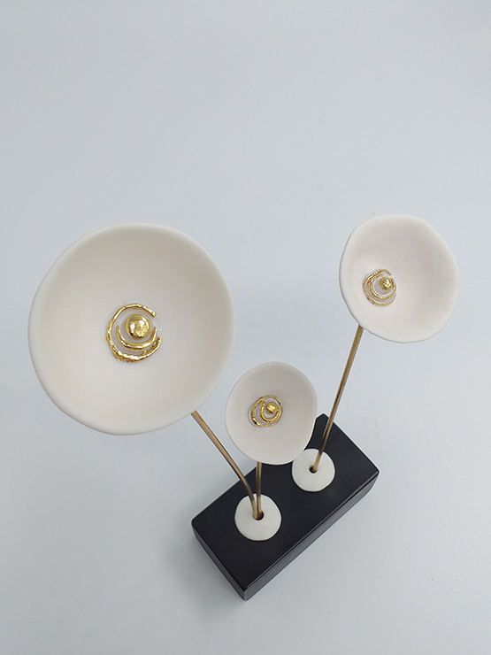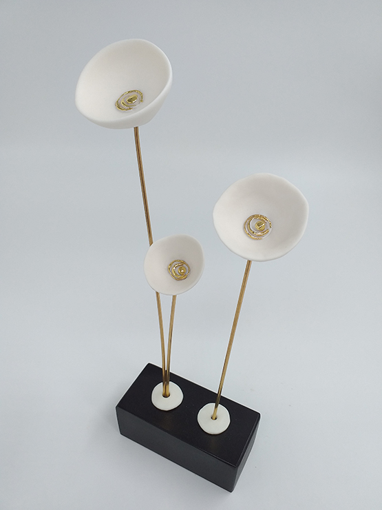 Χειροποίητο επιτραπέζιο διακοσμητικό με παπαρούνες, από εξαιρετικής ποιότητας λευκή πορσελάνη, ψημένη στους 1250°C. Ο χρυσός είναι 24k ψημένος στους 840°C. Στηρίζεται σε κεραμική βάση και το μέταλλο που ολοκληρώνει τον σχεδιασμό του είναι λουστραρισμένος ορείχαλκος (μπρούτζος).