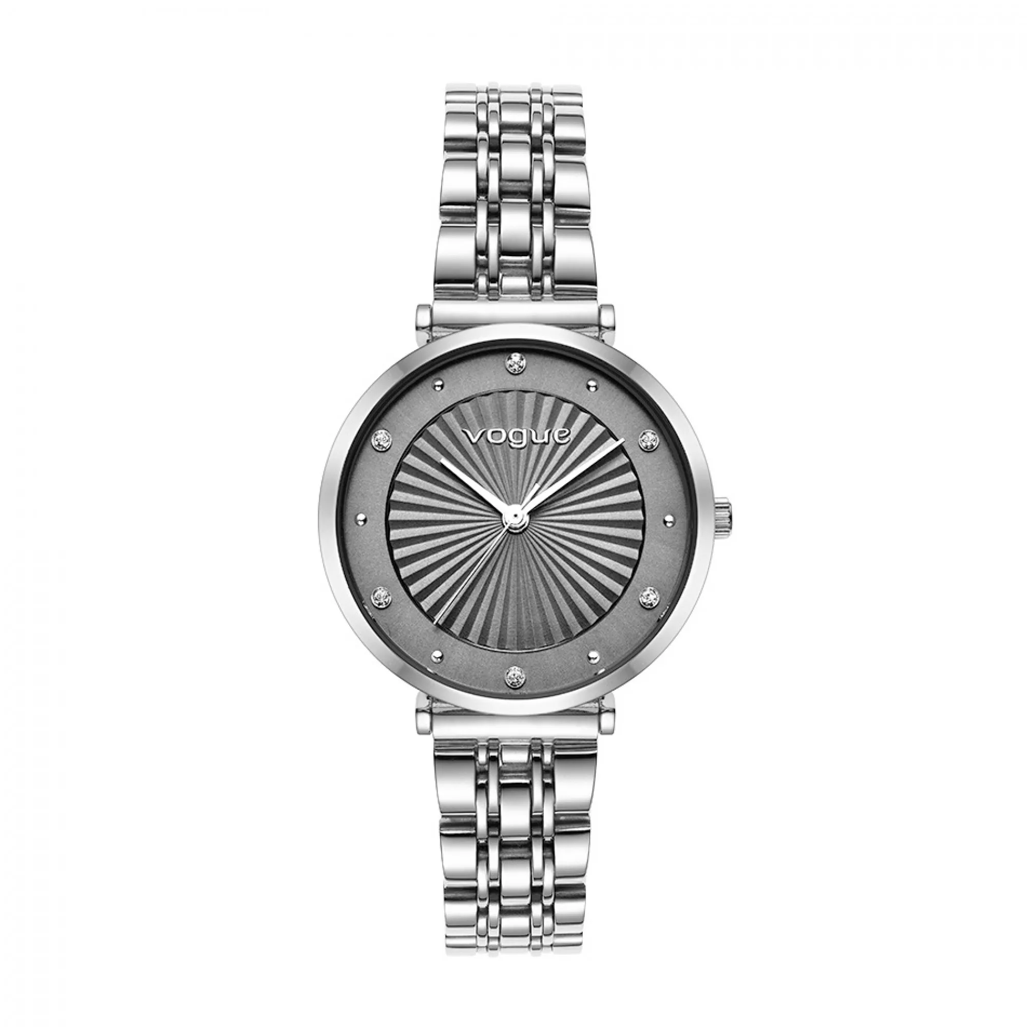 Γυναικείο ρολόι VOGUE, με ανοιχτό γκρι μεταλλικό χρώμα , έξι (6) λευκά λαμπερά ζιργκόν και ασημί ατσάλινο μπρασελέ.