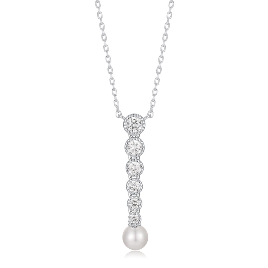 Ένα εντυπωσιακό κολιέ σχέδιο μονόπετρα με μαργαριτάρι της collection Pearl απο επιπλατινωμένο ασήμι 925° με λευκό ζιργκόν.Μήκος αλυσίδας 38+5CM