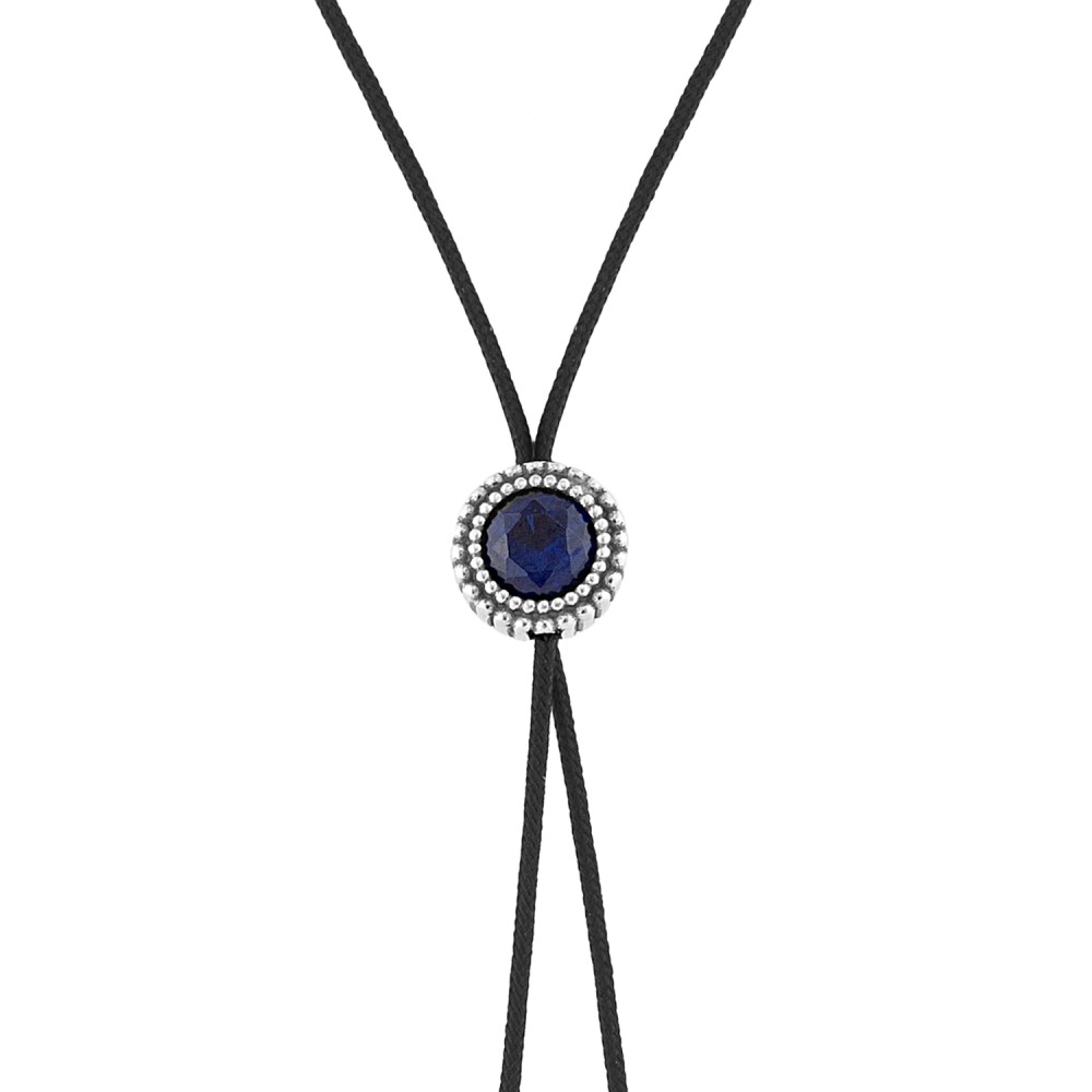 Ένα κομψό κολιέ γραβάτα, με στρογγυλή μπλε πέτρα και ρυθμιζόμενο κορδόνι από επιπλατινωμένο ασήμι 925°.