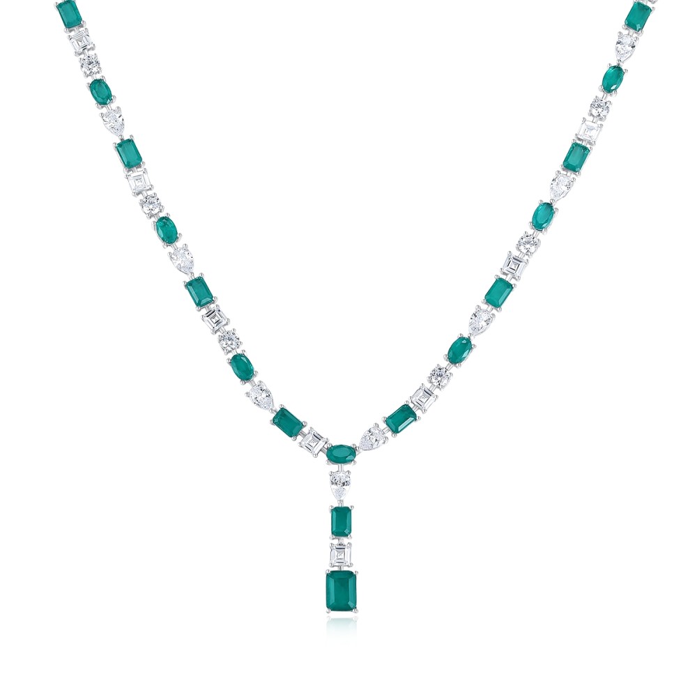 Ένα εντυπωσιακό κολιέ που θα μαγνητίσει όλα τα βλέμματα. Σχέδιο ριβιέρα από την συλλογής JEMS , με πράσινες και λευκές πέτρες ζιργκόν κοπής δάκρυ, από επιπλατινωμένο ασήμι 925°. Μήκος 43 εκατοστά.