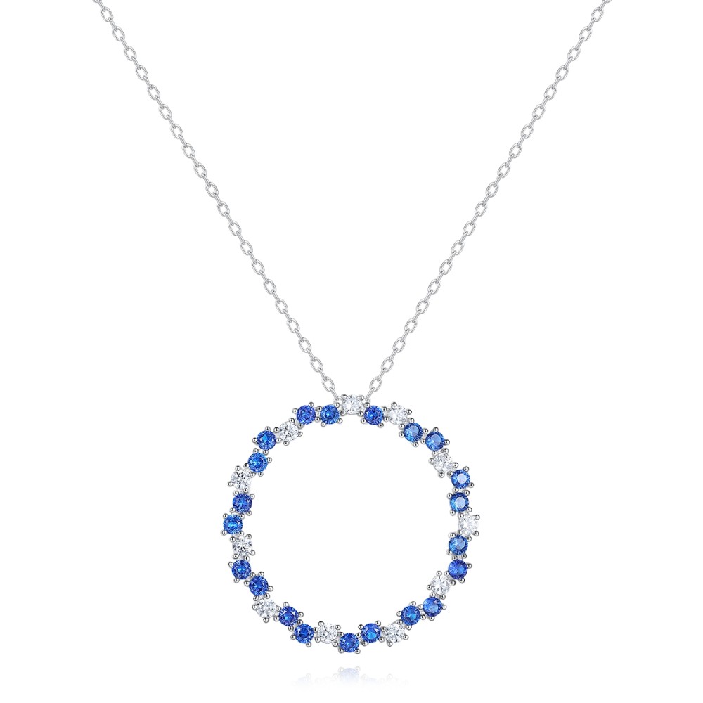 Ένα εντυπωσιακό κολιέ που θα μαγνητίσει όλα τα βλέματα σχέδιο κύκλος με αλυσίδα από την συλλογή Jems , με μπλε και λευκές πέτρες ζιργκόν από επιπλατινωμένο ασήμι 925°. Μήκος 38+5 εκατοστά. Mοτίφ Διάμετρος 29mm.