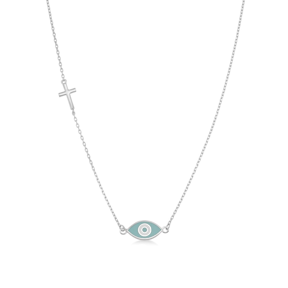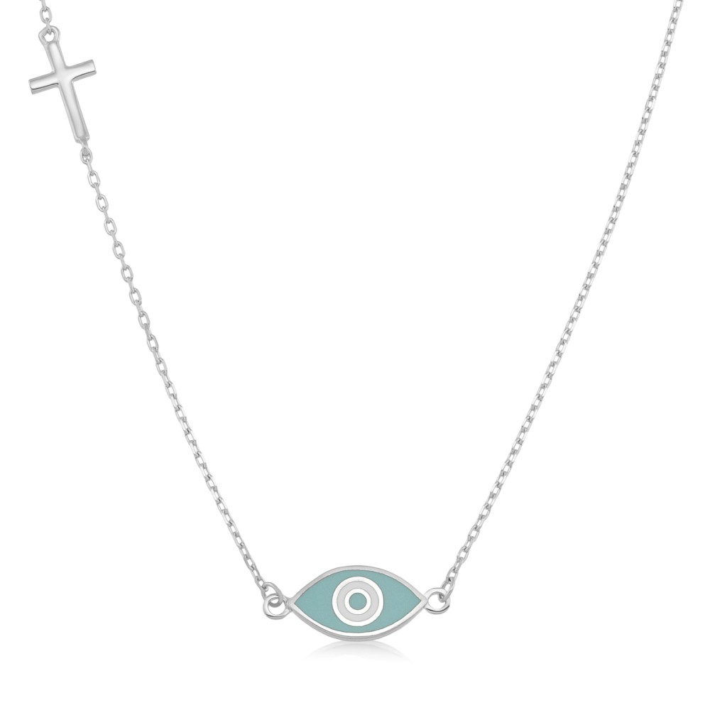 Ένα εντυπωσιακό κολιέ που θα μαγνητίσει όλα τα βλέμματα. Σε σχέδιο μάτι με σταυρό, από την συλλογή mati, με γαλάζιο και λευκό σμάλτο από επιπλατινωμένο ασήμι 925°.