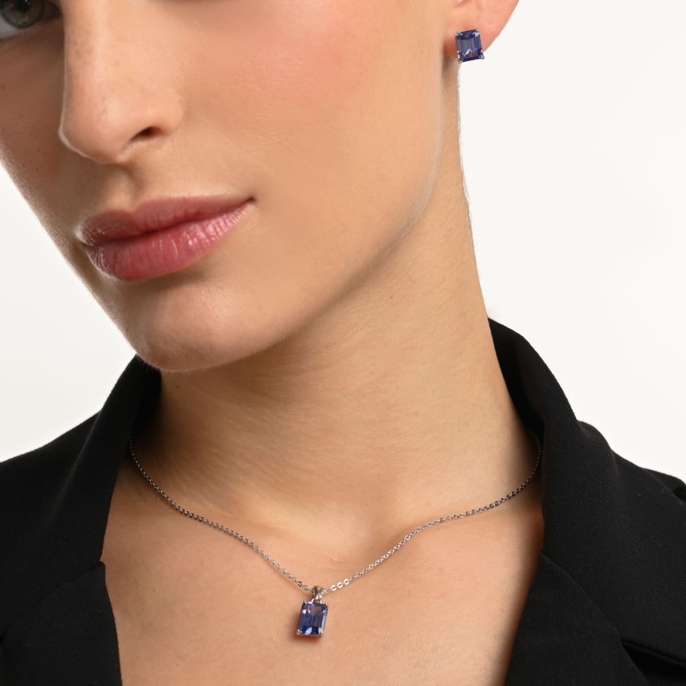 Ένα κομψό κολιέ μονόπετρο παραλληλόγραμμο με μπλε ζιργκόν της collection JEMS, από επιπλατινωμένο ασήμι 925°.