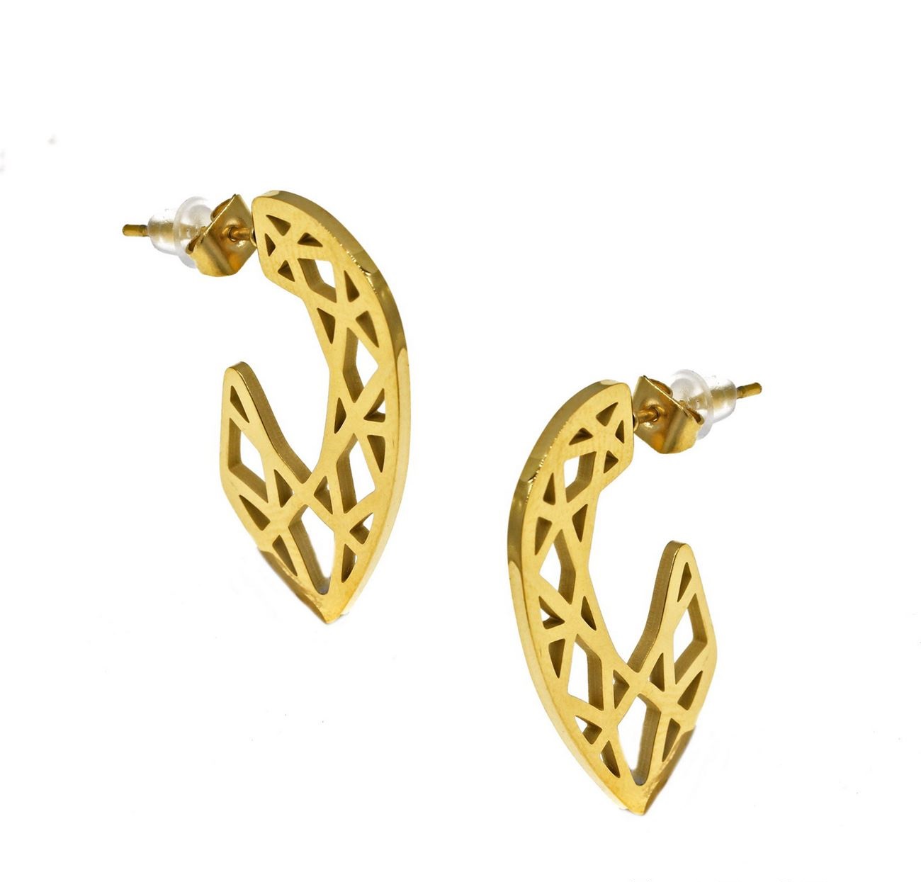 Ένα εντυπωσιακό σκουλαρίκι κρεμαστό, με σχέδιο triangle σε πλέγμα. Ατσάλινο και επιχρυσωμένο με κούμπωμα καρφάκι.