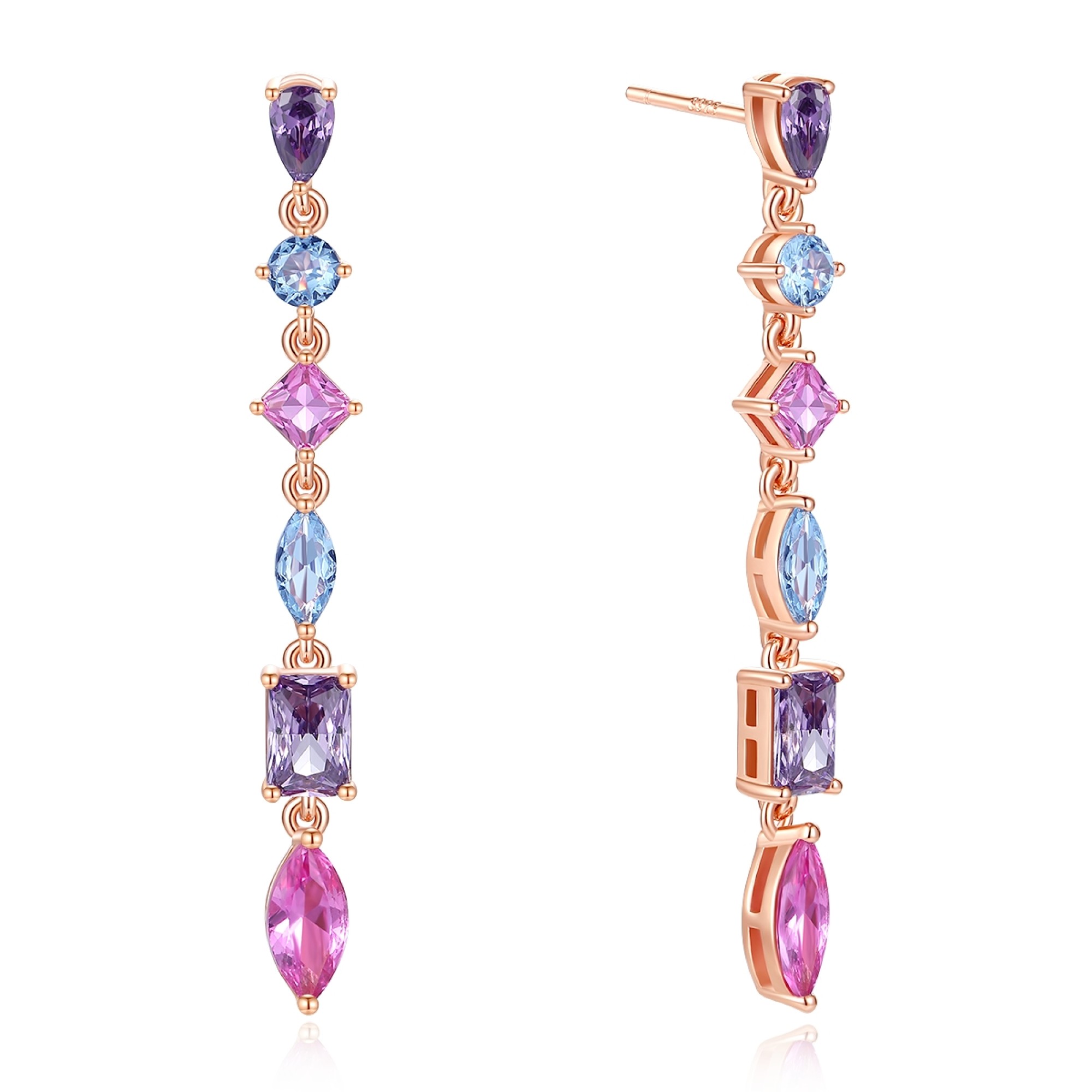 Ένα εντυπωσιακό ζευγάρι σκουλαρίκια κρεμαστά, σε σχέδιο ριβιέρα της collection Jems, από ροζ επιχρυσωμένο ασήμι 925° με χρωματιστά ζιργκόν Διαστάσεις: ύψος 45.5mm και πλάτος 4.3mm