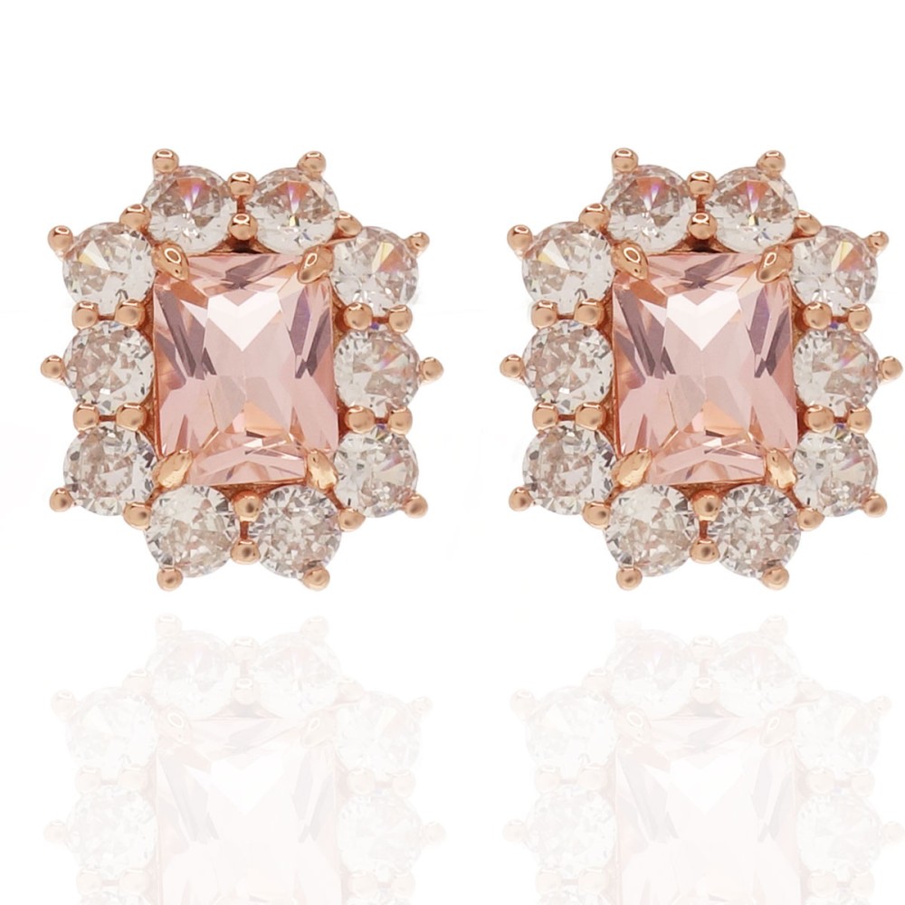 Ένα εντυπωσιακό ζευγάρι σκουλαρίκια ροζέτα της collection Jems, με ροζ (Morganite colour) και λευκά ζιργκόν από ροζ επιχρυσωμένο ασήμι 925°.