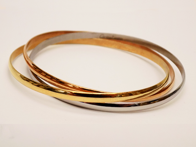 Εντυπωσιακό βραχιόλι με 3 βέργες πλεγμένες στις 3 αποχρώσεις ( πλατινωμένο-επίχρυσο-επίχρυσο ροζ).