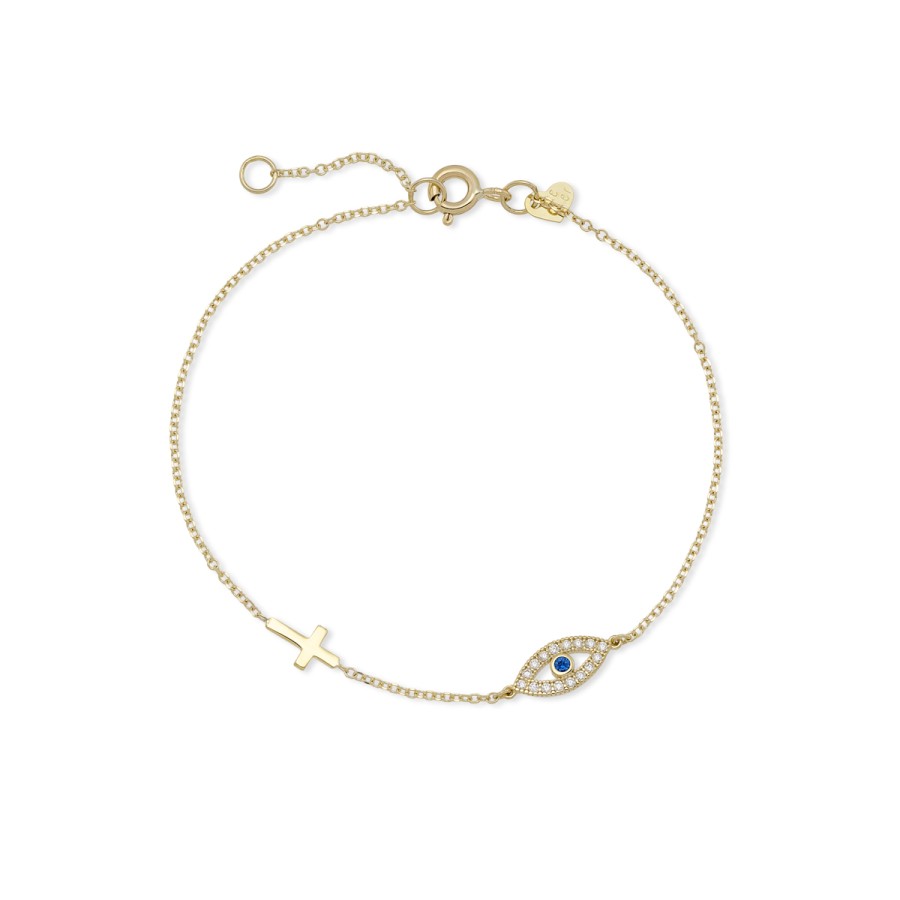 Ένα κομψό βραχιόλι με αλυσίδα σχέδιο σχήμα ματιού με πέτρες ζιργκόν και σταυρό από χρυσό 9 καρατιών.