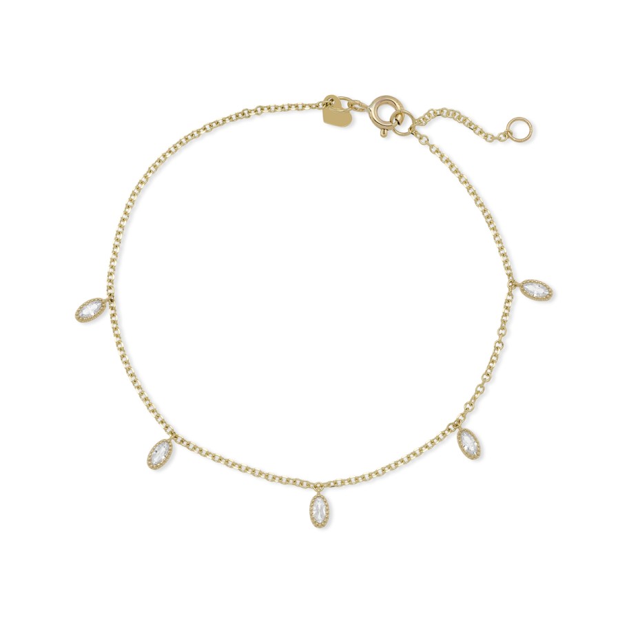 Ένα κομψό βραχιόλι με αλυσίδα σχέδιο με πέντε μονόπετρα κρεμαστά με πέτρες ζιργκόν από χρυσό 9 καρατιών.