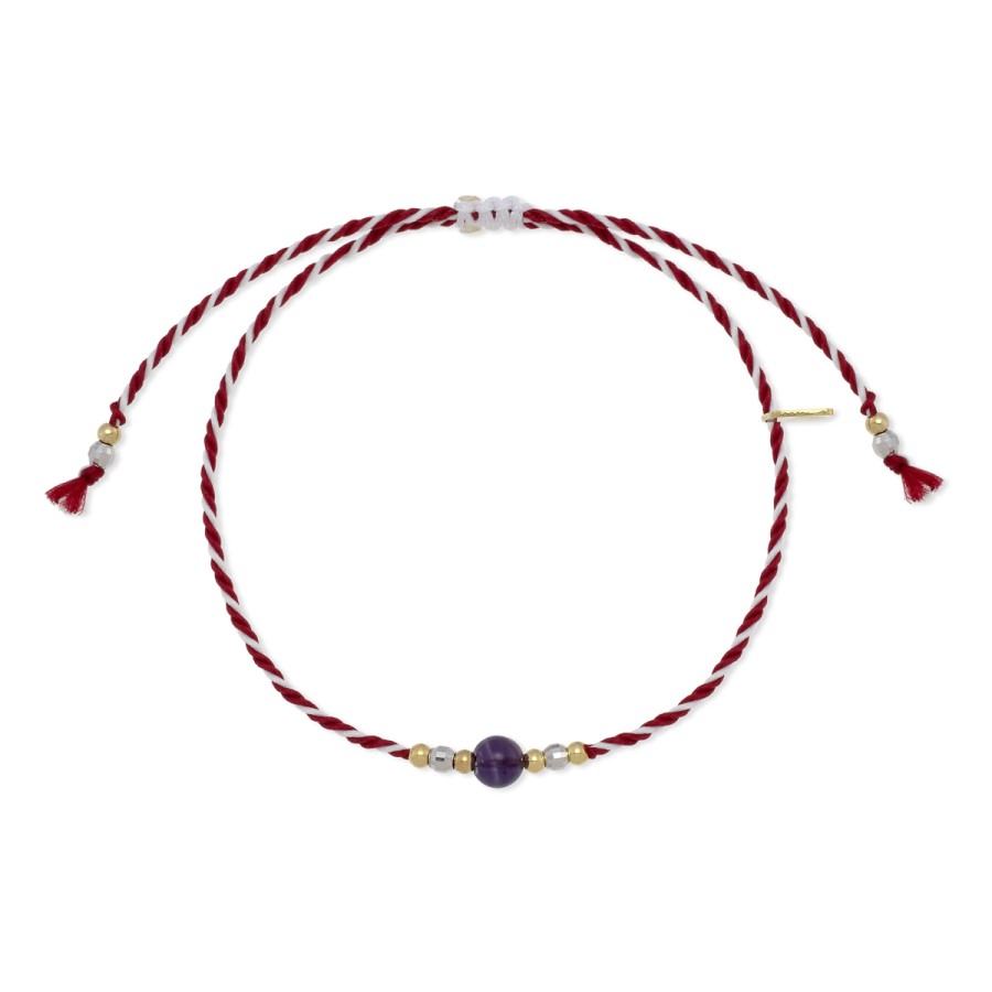 Βραχιόλι Μαρτάκι από στριφτό κορδόνι σε κόκκινο και λευκό, διακοσμημένο με φυσικό αμέθυστο και λεπτομέρειες από ασήμι 925 επιπλατινωμένο και επιχρυσωμένο.