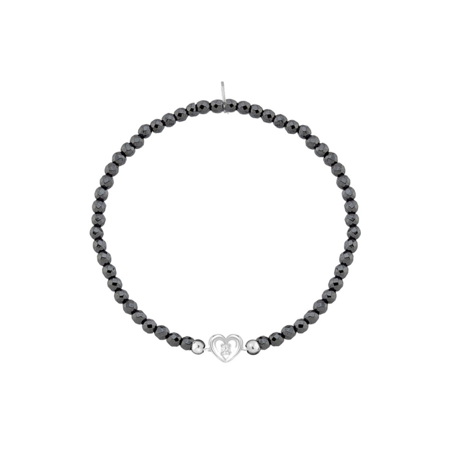 Ένα βραχιόλι ελαστικό σχέδιο Καρδιά της σειράς elle από επιπλατινωμένο ασήμι 925°, με λευκή πέτρα ζιργκόν και ημιπολύτιμες πέτρες αιματίτη.