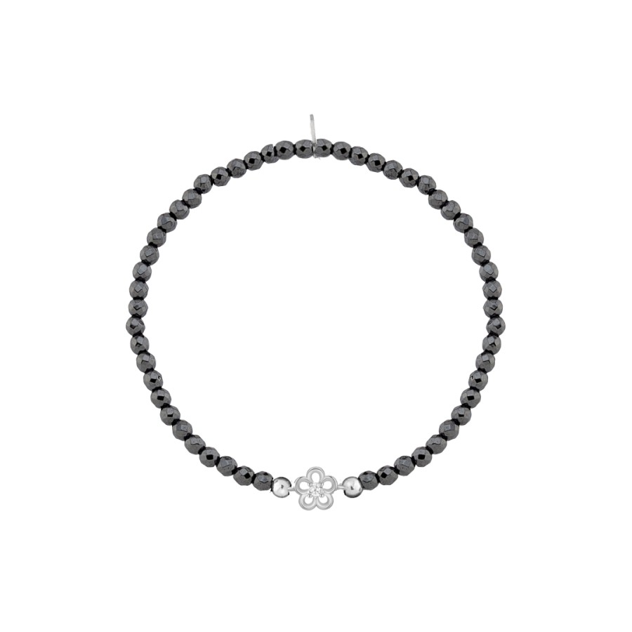 Ένα βραχιόλι ελαστικό σχέδιο λουλούδι της σειράς elle από επιπλατινωμένο ασήμι 925°, με λευκή πέτρα ζιργκόν και ημιπολύτιμες πέτρες αιματίτη.
